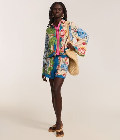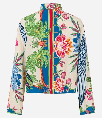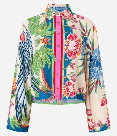 Ref: Camisa feminina curta confeccionada em viscose certificada mais sustentável, modelo com gola colarinho, abotoamento frontal, manga longa sino e estampa tropical.