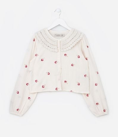 Camisa Curta Infantil com Gola em Crochê - Tam 5 a 14 Anos