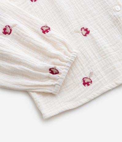 Camisa curta infantil confeccionada em anaruga, texturizada, com babado em crochê na gola, mangas longas, fechamento por botões e bordado de mini cogumelos.