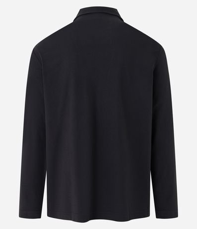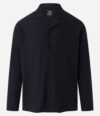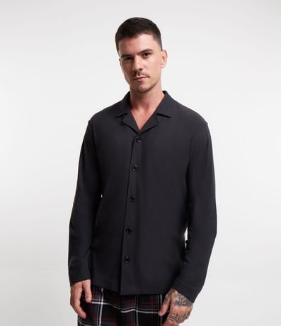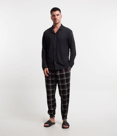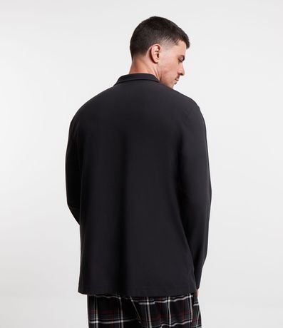 Pijama masculino, modelo camisa em fleece, com gola lapela, abotoamento frontal, mangas longas e superfície sem estampa.
