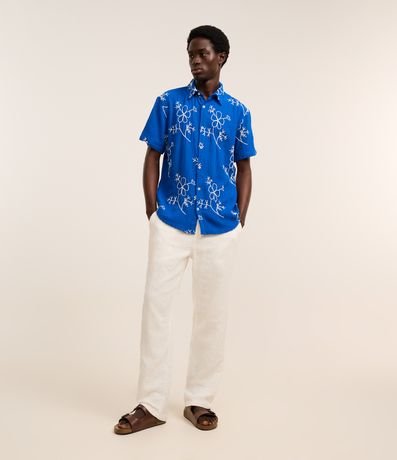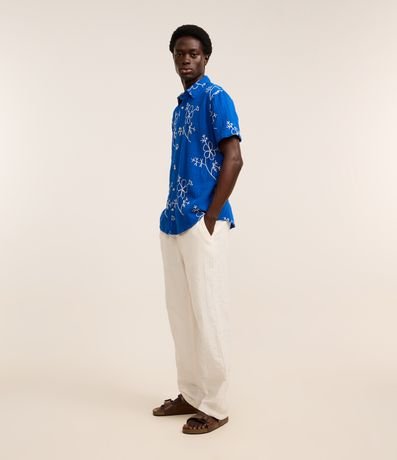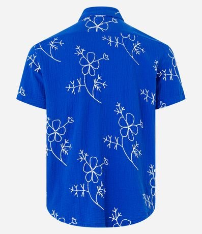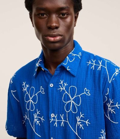 Camisa masculina confeccionada em algodão mais sustentável, gola colarinho, abotoamento frontal e manga curta. Peça com estampa bordada em formato floral contrastante.