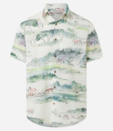 Ref: Camisa masculina confeccionada em algodão mais sustentável, gola colarinho, abotoamento frontal e manga curta. Peça com estampa de paisagem minimalista.