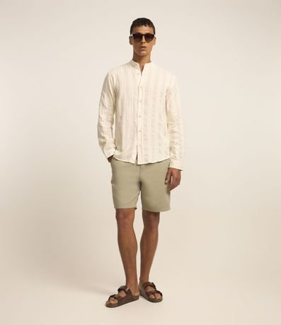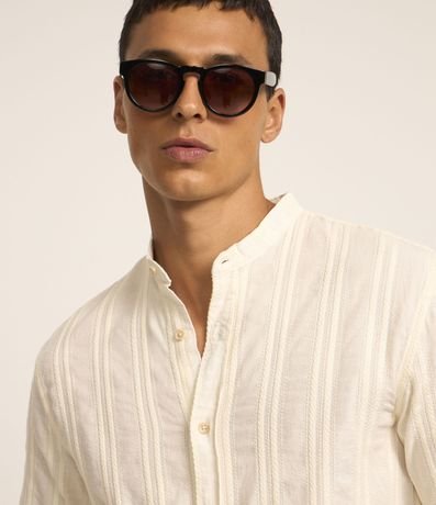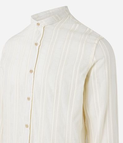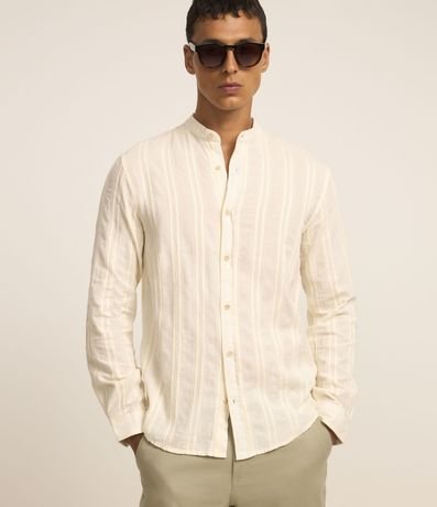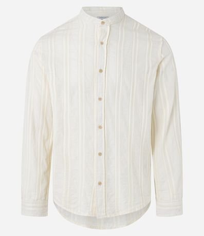 Camisa masculina confeccionada em algodão com gola padre, abotoamento frontal com manga longa e textura.