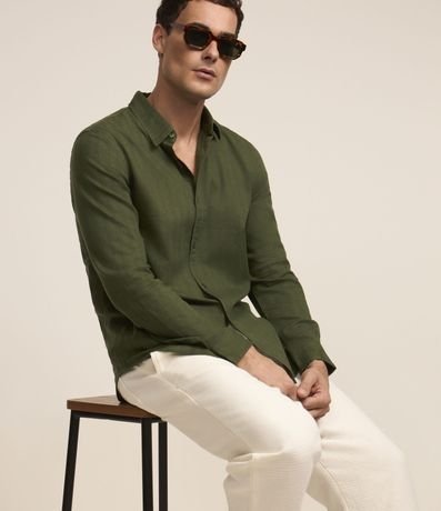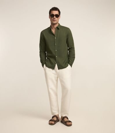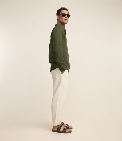 Camisa masculina confeccionada em material mais sustentável, gola colarinho, abotoamento frontal, manga longa. Peça com textura em listras finas verticais.