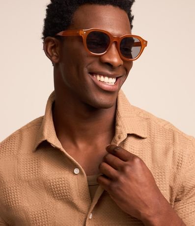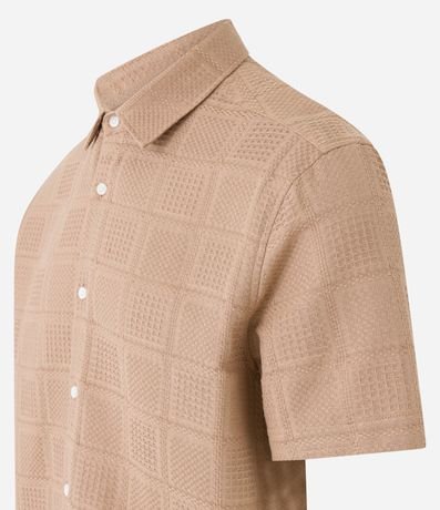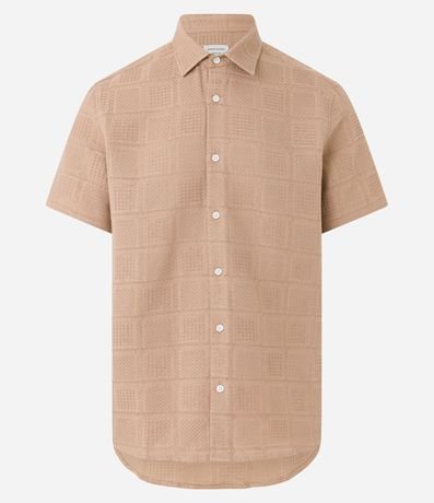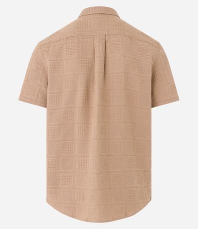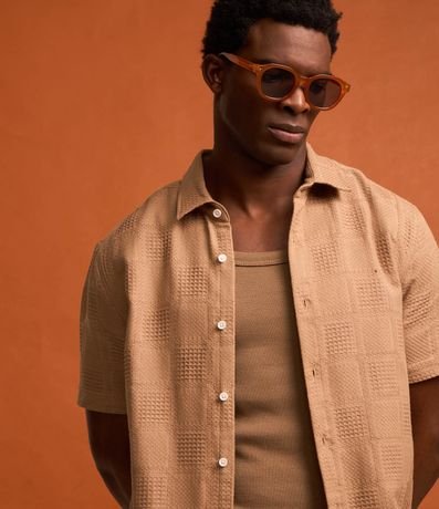 Camisa masculina, com gola colarinho, abotoamento frontal, manga curta. Peça confeccionada em algodão mais sustentável com textura patchwork.