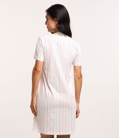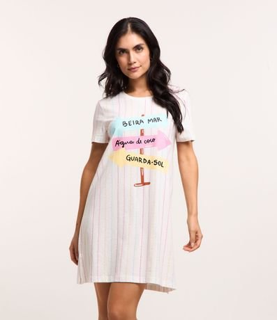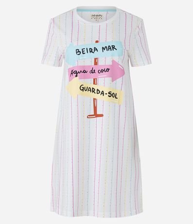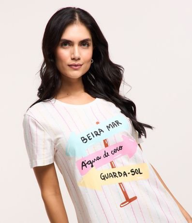 Ref: Camisola de mangas curtas confeccionada em algodão com gola redonda além de listras verticais coloridas e lettering com temática setas na praia.