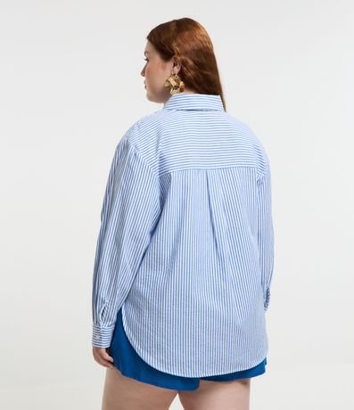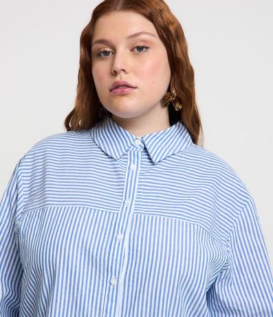 Camisa plus size alongada confeccionada em tecido ana ruga com colarinho na gola, botões frontais para fechamento e mangas longas. Conta com tecido listrado.