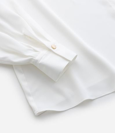 Camisa alfaiatada confeccionada em cetim sem estampa. A camisa tem mangas longas e amplas, ombro bufante, botões nos punhos e abotoamento frontal.