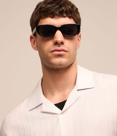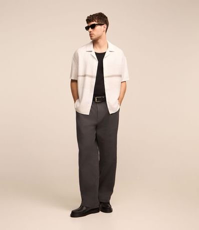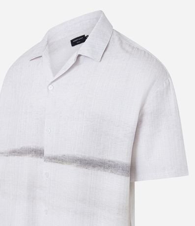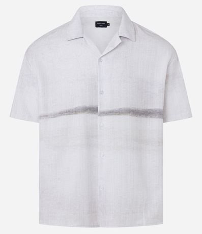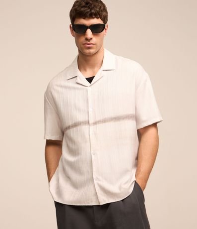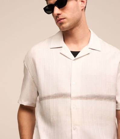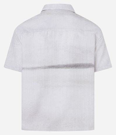 Camisa masculina em cetim, gola colarinho, manga curta. Peça estampa com degrade e detalhe de listra central.