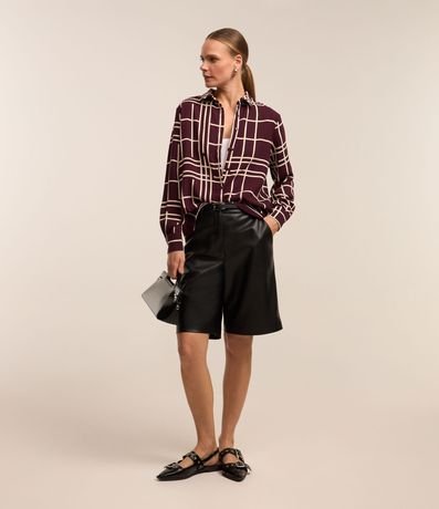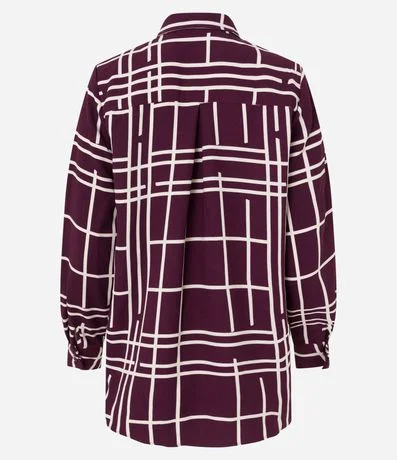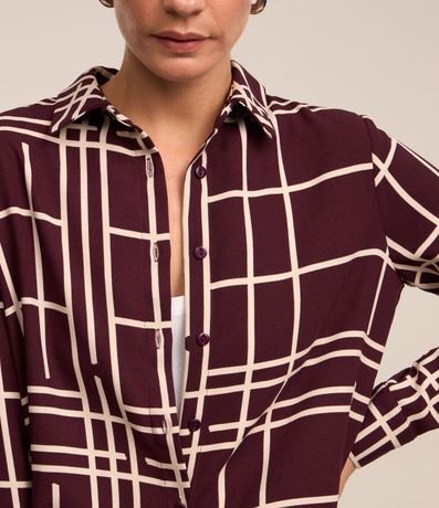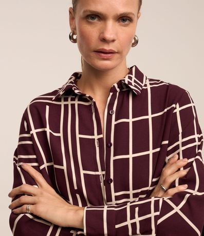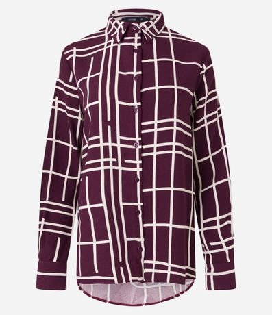 Camisa feminina, confeccionada em crepe, com gola lapela, abotoamento frontal, mangas longas e estampa grid geométrico.