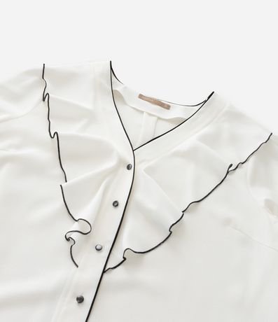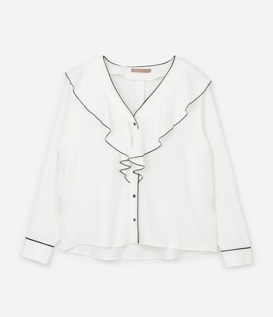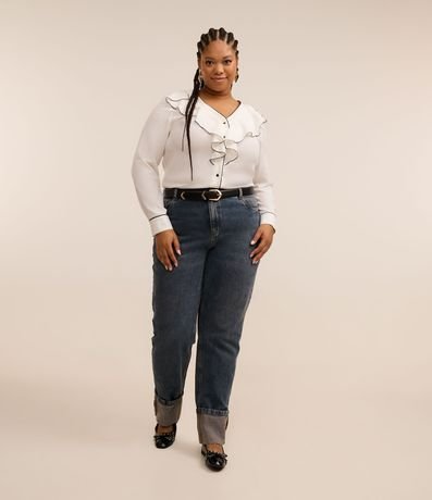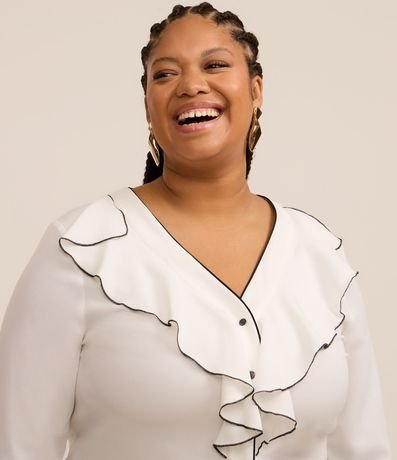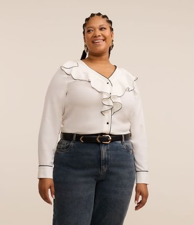 Ref: Camisa plus size feminina confeccionada em crepe, com gola babado jabô e mangas longas. Sem estampa, o produto possui diferencial de frisos e botões contrastantes.