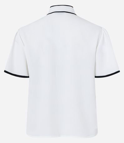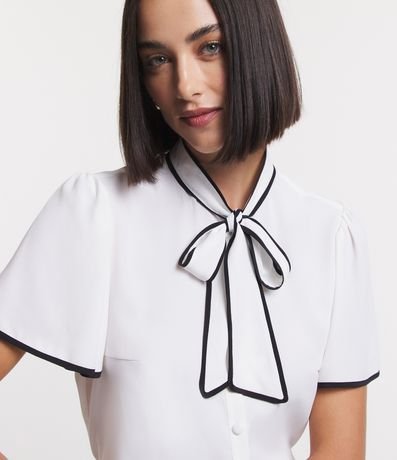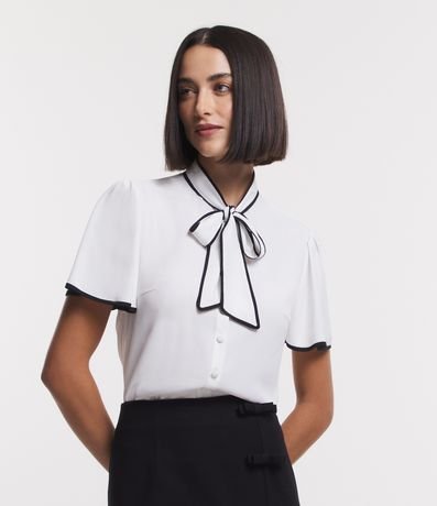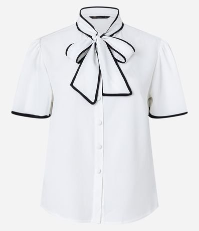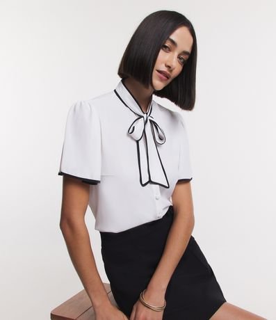 Ref: Camisa feminina confeccionada em crepe, com mangas curtas e gola laço. Sem estampa, possui detalhe de contornos contrastantes e fechamento frontal com botões.