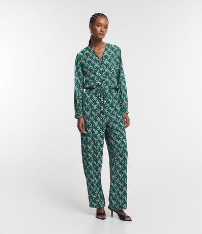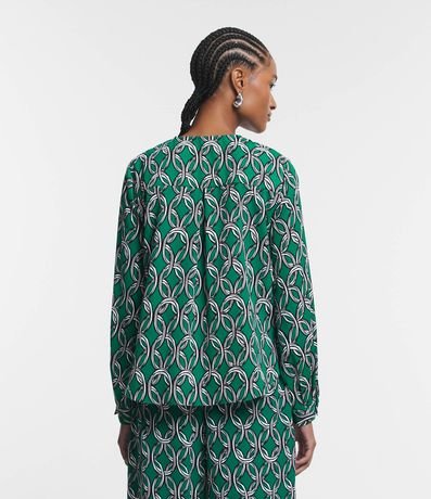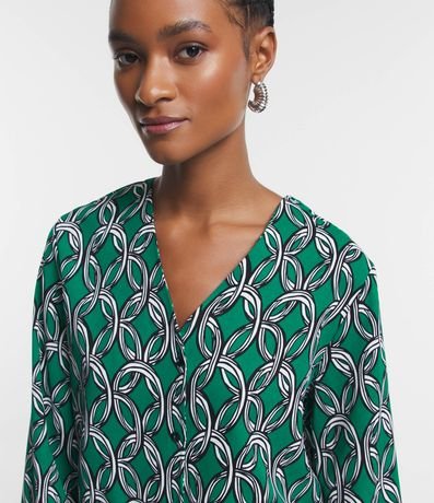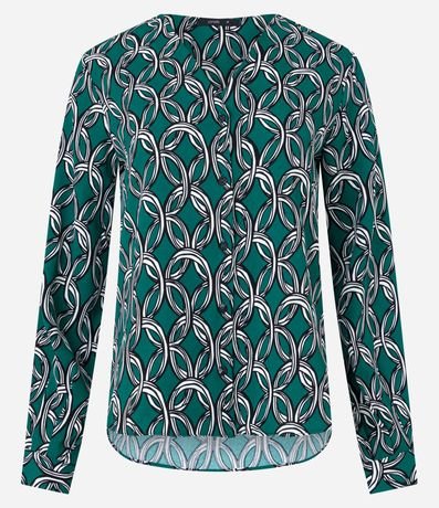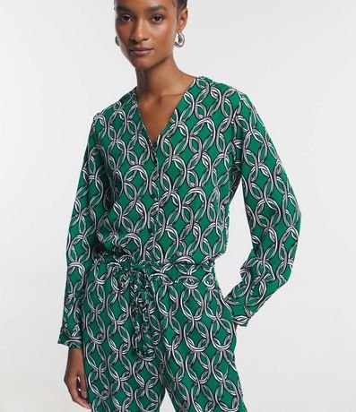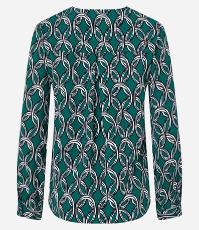 Ref: Camisa feminina em crepe, com gola V, abotoado frontal, manga longa, prega nas costa e estampa com correntes entrelaçadas.