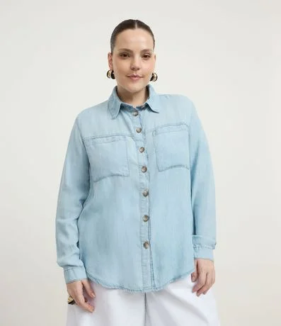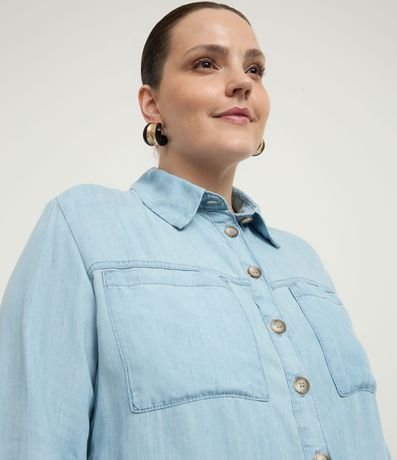 Ref: Camisa jeans confeccionada com liocel mais sustentável. A peça tem gola colarinho, mangas longas, bolsos frontais quadrados, abotoamento frontal e barra traseira alongada.