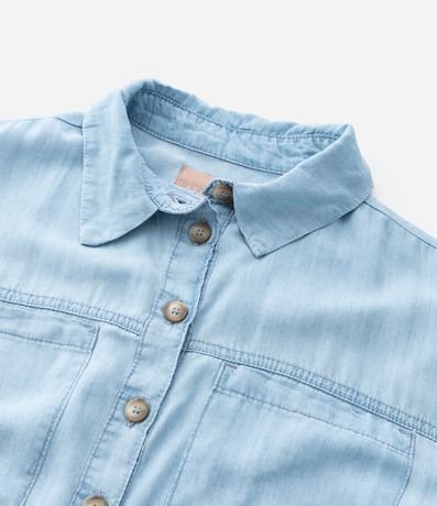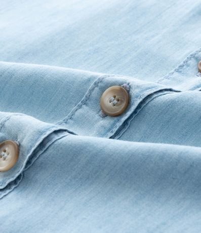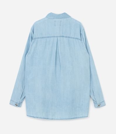 Ref: Camisa jeans confeccionada com liocel mais sustentável. A peça tem gola colarinho, mangas longas, bolsos frontais quadrados, abotoamento frontal e barra traseira alongada.