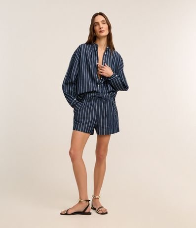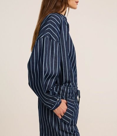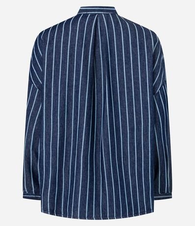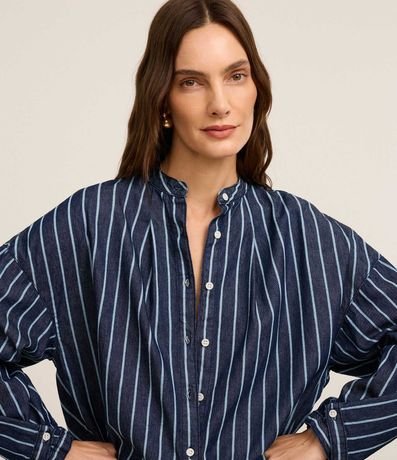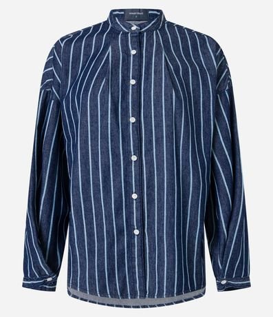 Camisa feminina em jeans de algodão certificado bci, peça com gola padre, abotoamento frontal, manga longa e listras verticais.