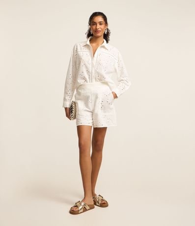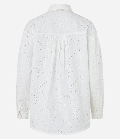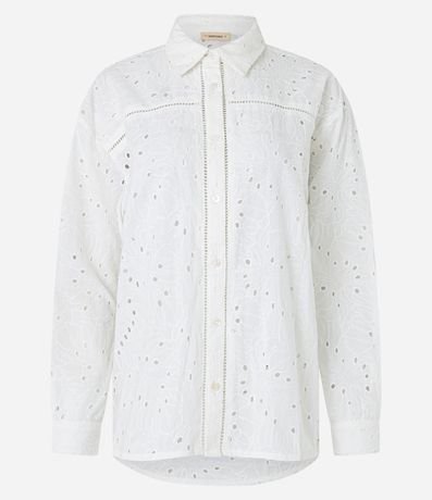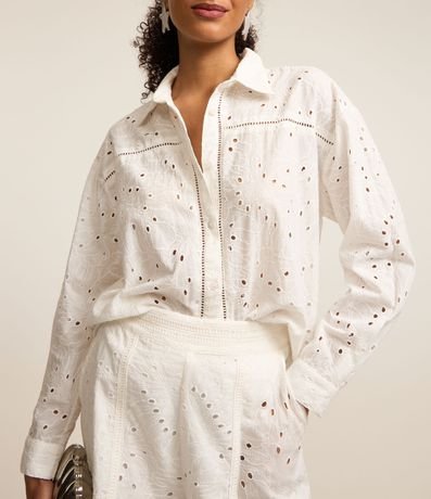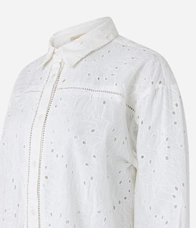 Ref: Camisa feminina, confeccionada em laise, com gola lapela, abotoamento frontal e detalhes de entremeios.