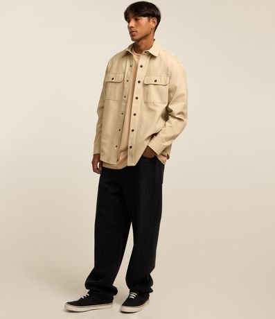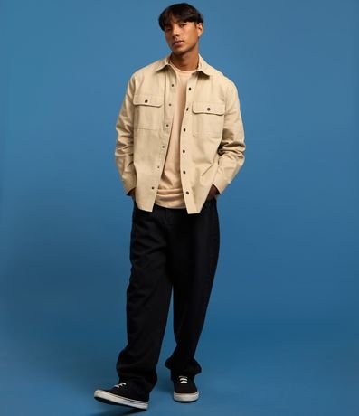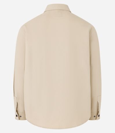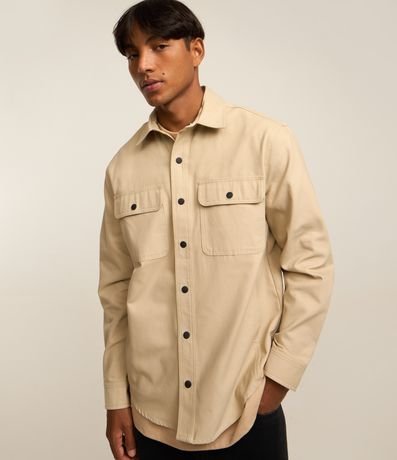 Camisa manga longa, confeccionada em sarja, bolsos no peito com lapela, abotoamento frontal e nos punhos.