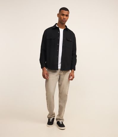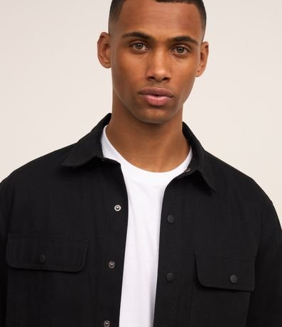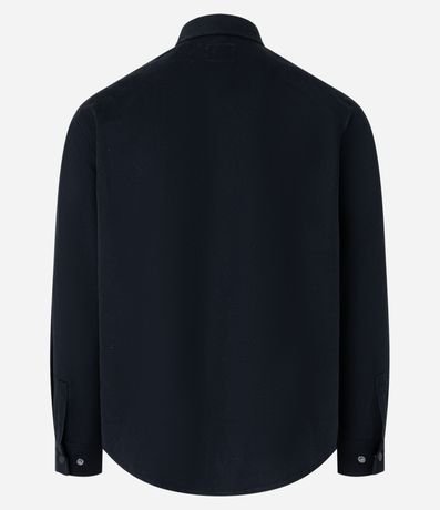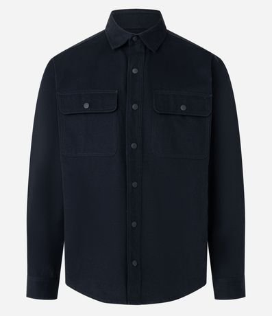 Camisa manga longa, confeccionada em sarja, bolsos no peito com lapela, abotoamento frontal e nos punhos.