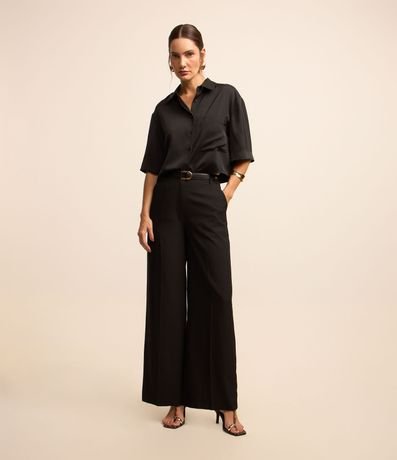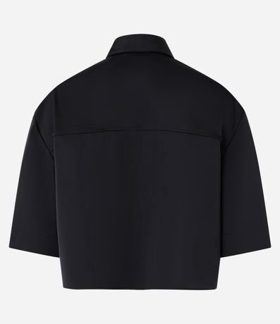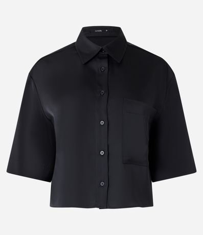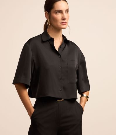 Ref: Camisa de mangas curtas confeccionada em tecido acetinado com bolso frontal e cavas deslocadas.