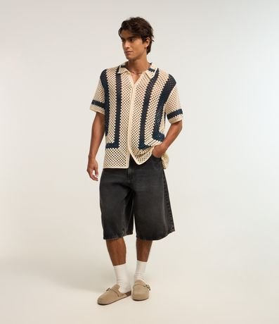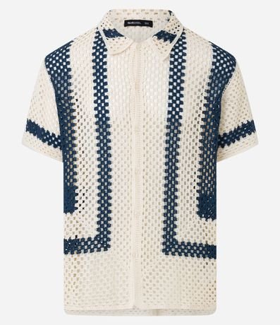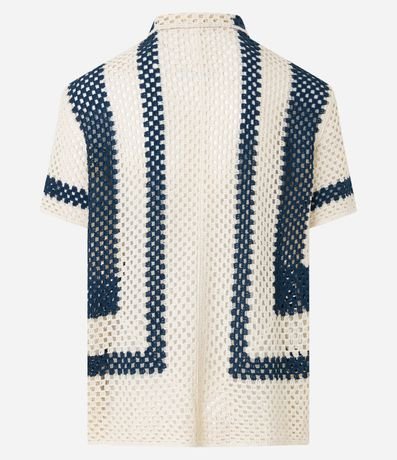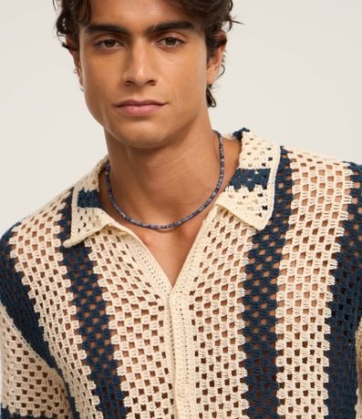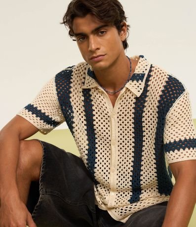 Camisa masculina, confeccionada em tricô leve, com gola lapela, abotoamento frontal e mangas curtas. A peça conta com padronagem em linhas.