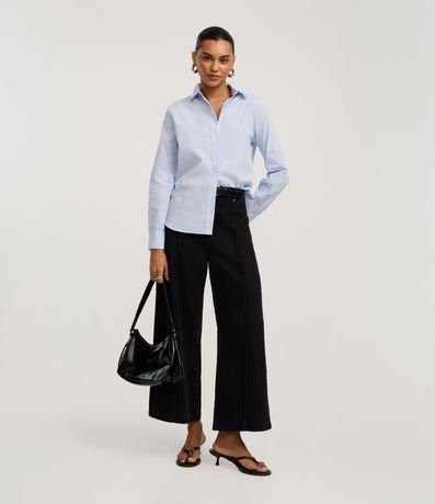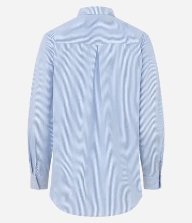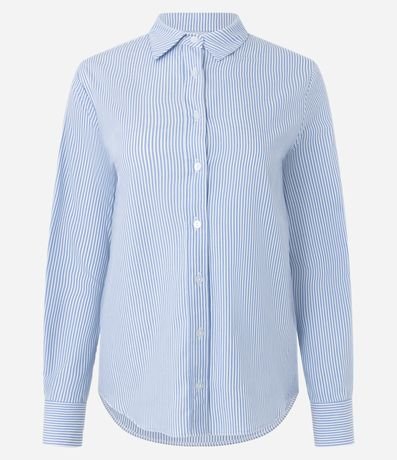 Camisa feminina, confeccionada em tricoline, com gola lapela, abotoamento frontal, mangas longas e estampa listras em fio tinto.