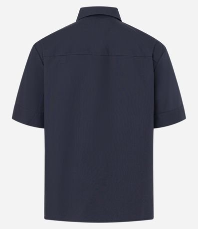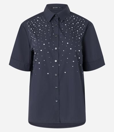 Camisa feminina, confeccionada em tricoline, com mangas curtas, gola lapela, abotoamento frontal e aplicação de strass.