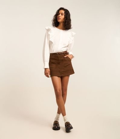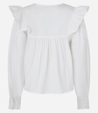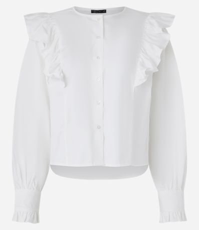 Ref: Camisa feminina confeccionada em tricoline, com gola redonda e mangas longas bufantes. Sem estampa, possui recorte franzido nas costas e babados nos ombros e peito.
