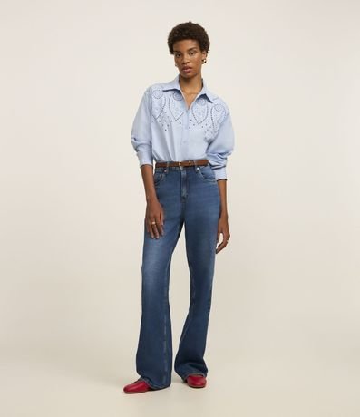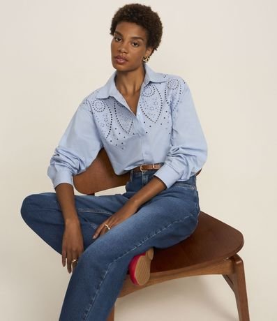 Ref: Camisa feminina confeccionada em tricoline, gola colarinho, abotoamento frontal, bordado vazado frontal, manga longa.