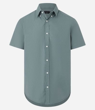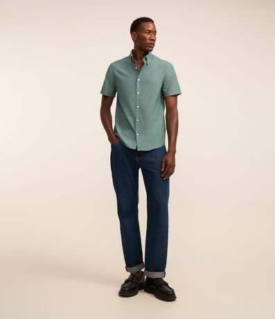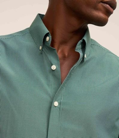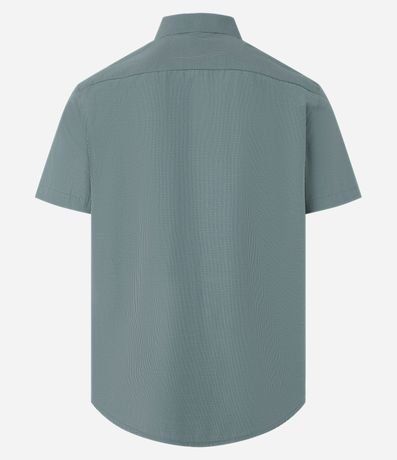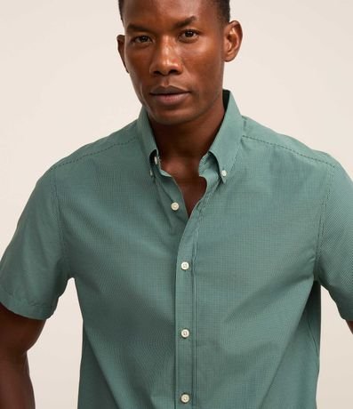 Camisa de mangas curtas, confeccionada em tricoline com algodão certificado BCI, com colarinho na gola e abotoamento frontal. Conta com estampa xadrez com quadros bem pequenos.