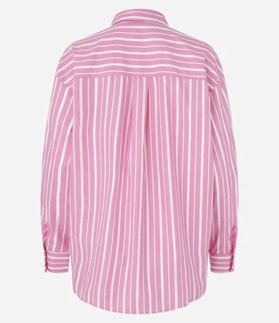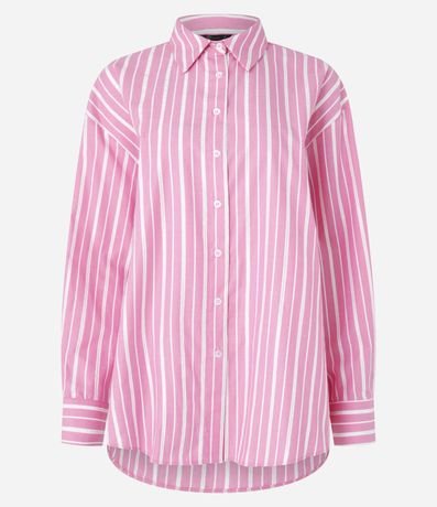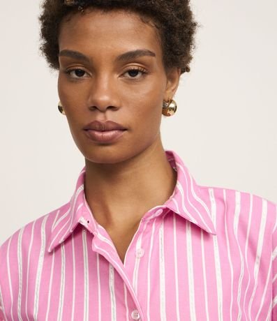 Camisa feminina confeccionada em tricoline, de material mais sustentável, com gola colarinho, mangas longas, listras a fio tinto e aplicação de fio metalizado.