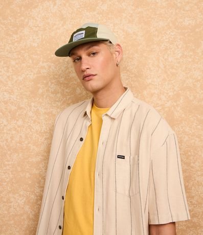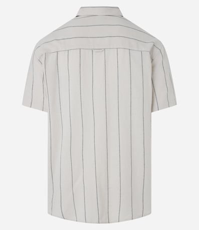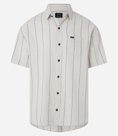 Ref: Camisa masculina confeccionada em tricoline mais sustentável, gola colarinho, abotoamento frontal. Peça com mangas curtas, listras verticais e bolso