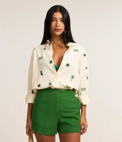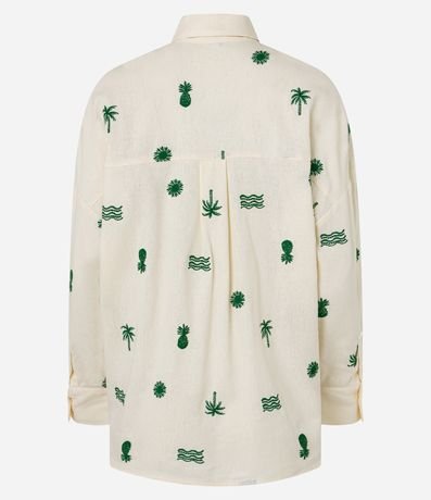 Ref: Camisa de mangas longas com cavas deslocadas, confeccionada em viscolinho, com colarinho na gola e bordados com ícones tropicais. Este produto possui viscose certificada em sua composição, sendo ambientalmente mais responsável.