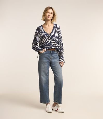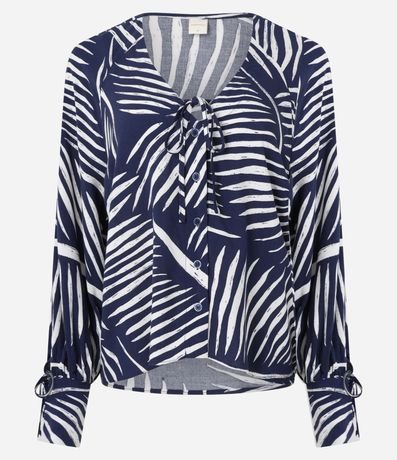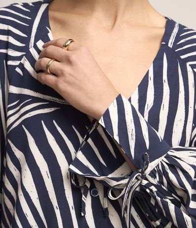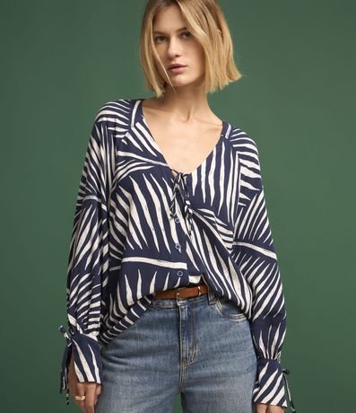 Ref: Camisa feminina confeccionada em viscose, decote em v com amarração, abotoamento frontal, manga longa com amarração estampa de listras abstratas.
