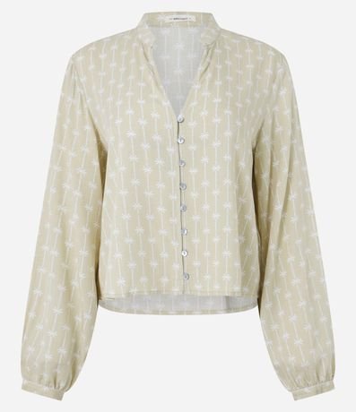 Ref: Camisa feminina confeccionada com material mais sustentável. Possui gola padre, fechamento por botões, mangas longas com punhos ajustados e estampa folhagens.