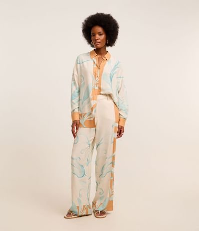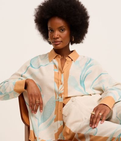 Camisa feminina, confeccionada em viscose e linho, com abotoamento frontal, mangas longas e estampa folhagens contrastantes.