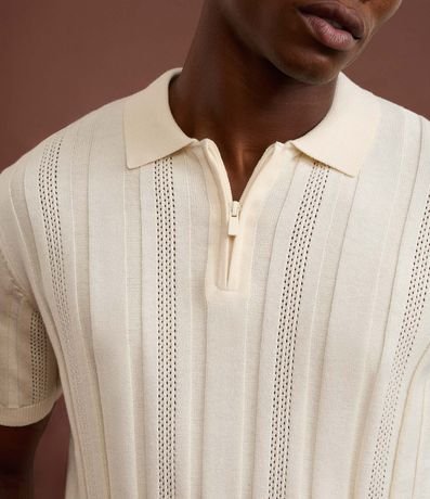 Ref: Camisa masculina confeccionada em algodão mais sustentável no modelo regular, possui gola polo com zíper, manga curta e textura com furinhos.