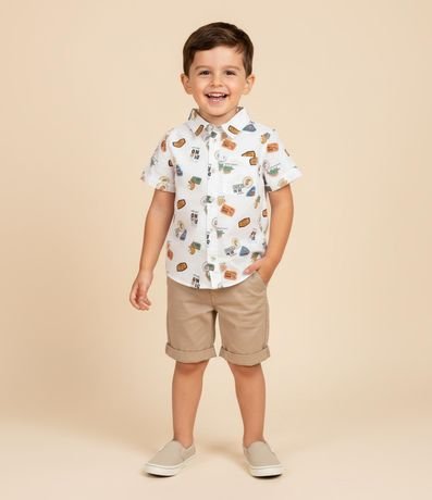 Ref: Camisa infantil confeccionada em algodão mais sustentável, com gola colarinho, manga curta, bolsinho e abotoamento frontal. Possui estampa de dinossauros.