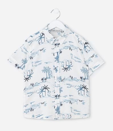Ref: Camisa infantil confeccionada linho e viscose mais responsável, com gola colarinho e mangas curtas. Possui estampa de coqueiros.