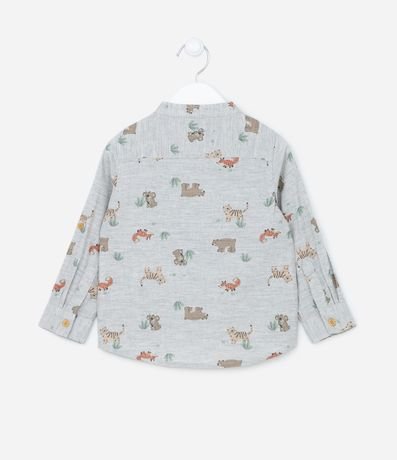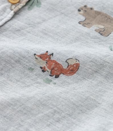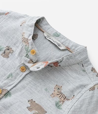 Camisa infantil confeccionada em algodão mais responsável, com gola padre e mangas longas. Possui estampa de bichinhos e abotoamento frontal total.