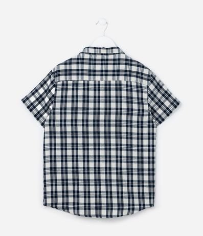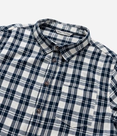 Camisa infantil confeccionada em flanela, de algodão certificado mais sustentável. Possui gola colarinho, manga curta, bolsinho no peito e estampa xadrez.