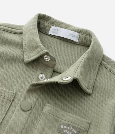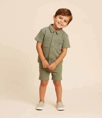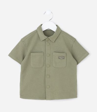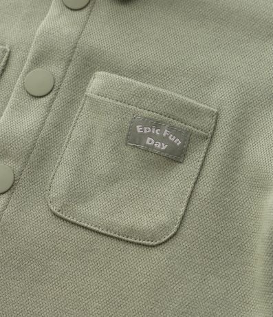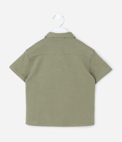 Camisa infantil confeccionada em piquet de algodão certificado BCI, com gola tradicional e mangas curtas. Possui abertura frontal com botões de pressão, dois bolsos aplicados no peito e etiqueta decorativa, oferecendo estrutura encorpada e textura característica do tecido.