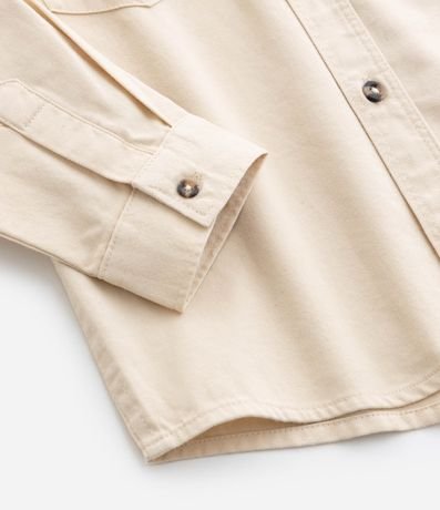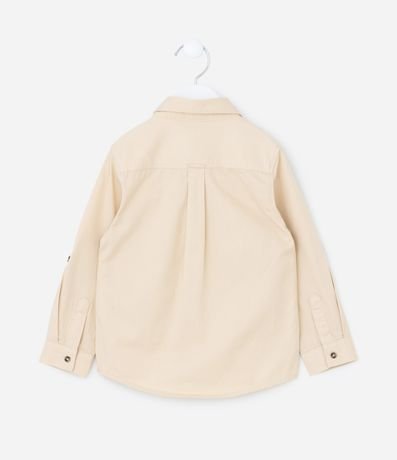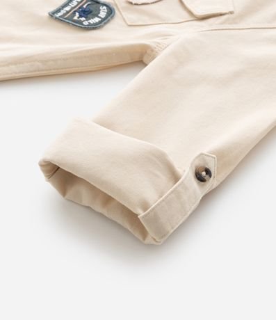 Ref: Camisa infantil confeccionada em sarja, com gola colarinho, bolsinhos frontais com lapela e patchs aplicados de dinossauro e raposinha. Possui fechamento por botões.
