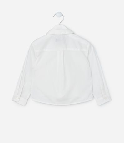 Camisa infantil confeccionada em tricoline, com gola colarinho, mangas longas com abotoamento e fechamento por botões também. Possui aplicação de laços.