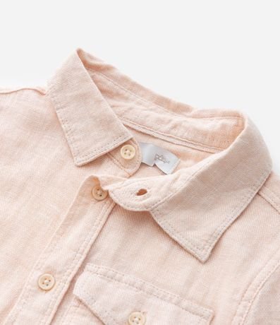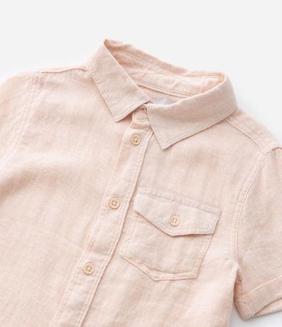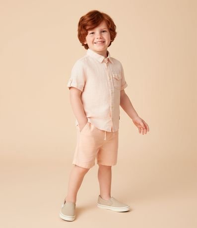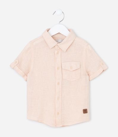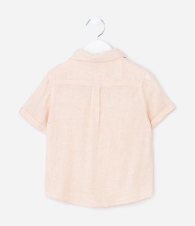 Camisa infantil confeccionada em linho e viscose, gola colarinho, manga curta com ajuste e abotoamento frontal. Peça com bolsinho com lapela.