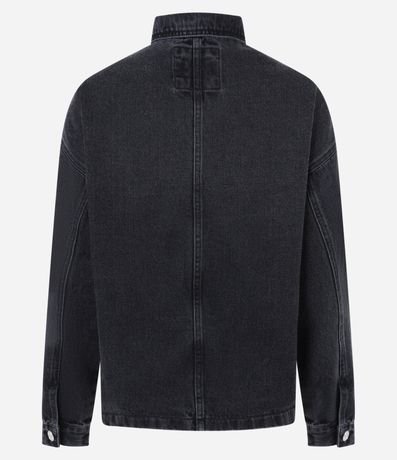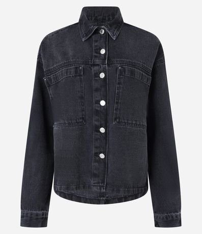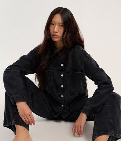 Ref: Camisa feminina, confeccionada em jeans, com abotoamento frontal, mangas longas e recortes. A peça conta com bolsos grandes no peito.