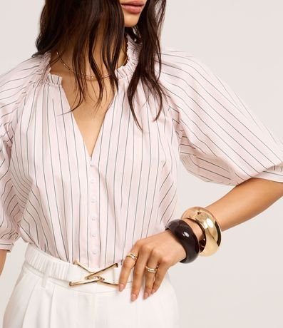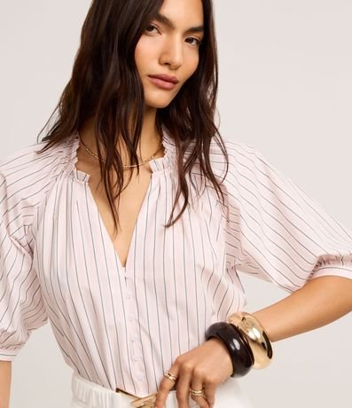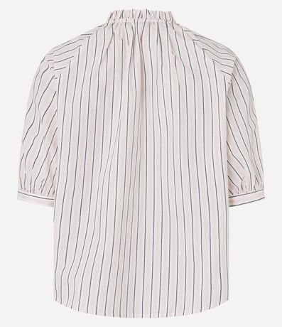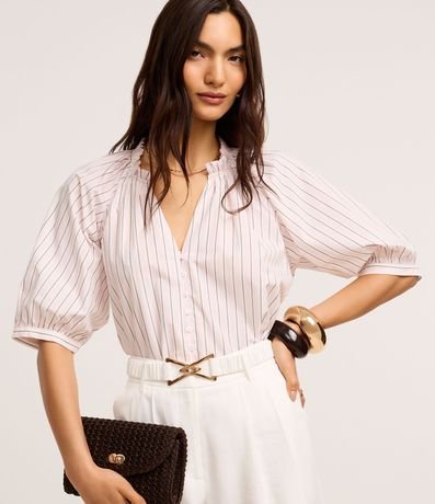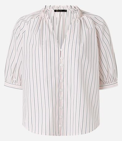 Ref: Camisa de mangas bufantes curtas, confeccionada em tricoline, com gola padre com frufrus, botões frontais e listras verticais em formas e cores variadas. Este produto possui algodão certificado BCI em sua composição, sendo ambientalmente mais responsável.