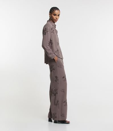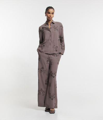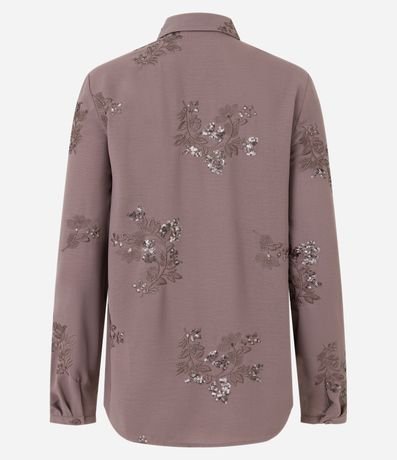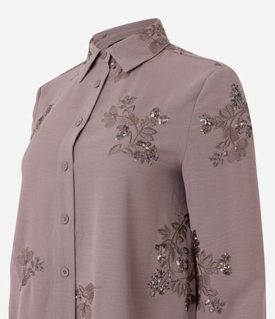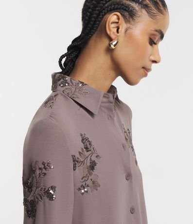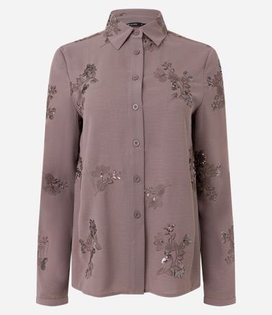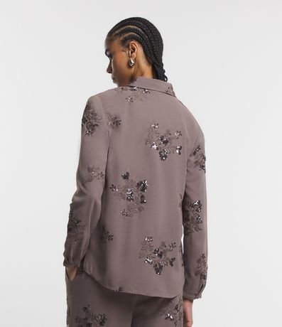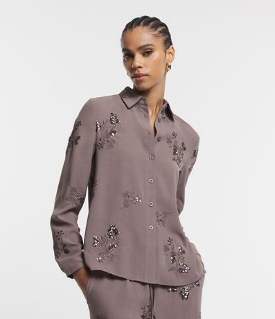Ref: Camisa feminina de manga longa, com gola colarinho e confeccionada em crepe airflow. Possui bordado floral com paetês.