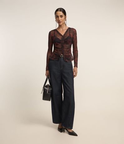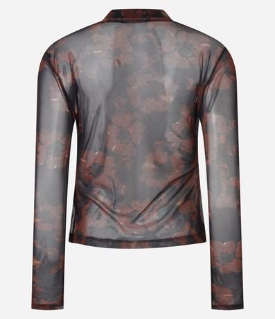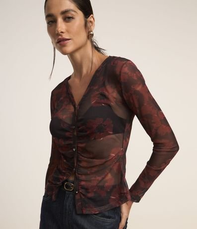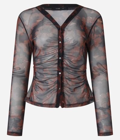 Ref: Camisa manga longa confeccionada em tule com transparência. Peça com decote V e estampa marmorizada floral.