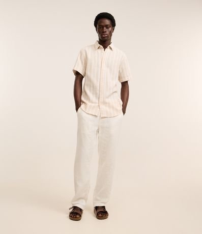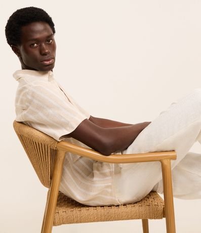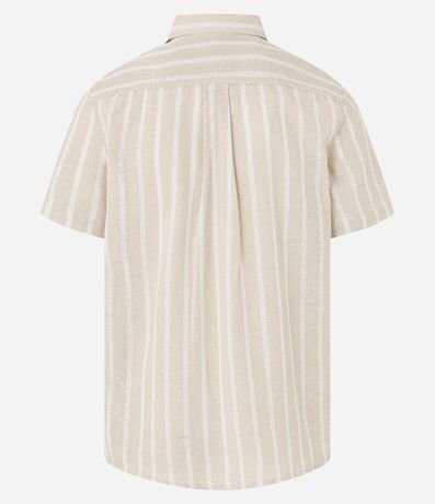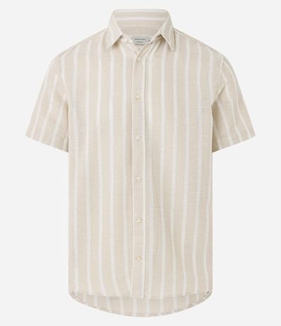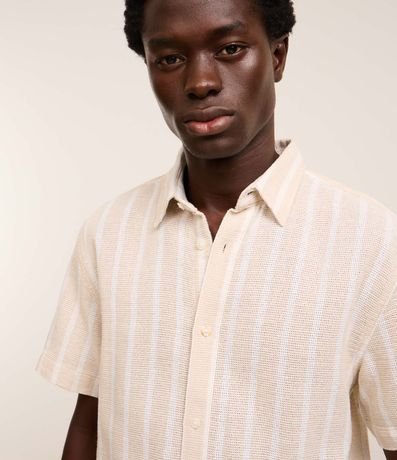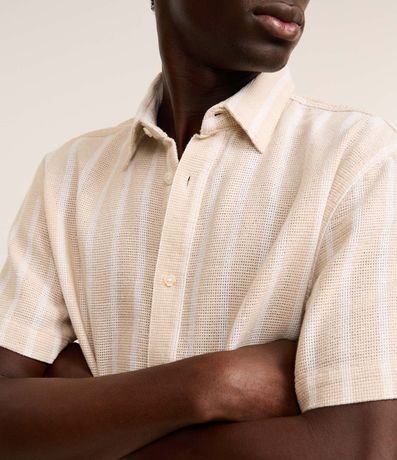 Ref: Camisa masculina confeccionada em material mais sustentável, com gola colarinho, manga curta e abotoamento frontal. Peça maquinetada com estampa listrada vertical contrastantes e textura furadinha.